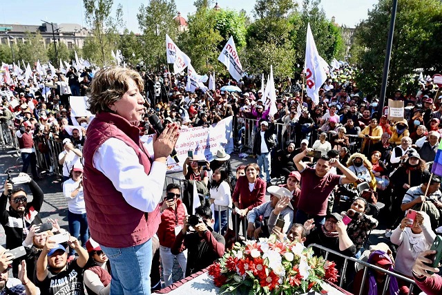 “Han sido 100 años de una oscura noche, pero pronto el pueblo mexiquense hará que amanezca. Este año, recibirán una inolvidable lección de dignidad quienes están unidos por seguirse repartiendo privilegios y robar. Porque si algo tenemos los mexiquenses es dignidad y nadie la va a comprar”, expresó la maestra Delfina Gómez en un emotivo discurso ante 22 mil militantes y simpatizantes congregados a un costado del Palacio de Gobierno de Toluca, en el Estado de México.