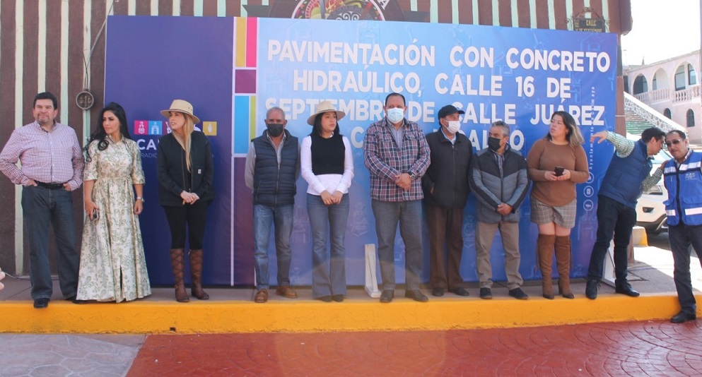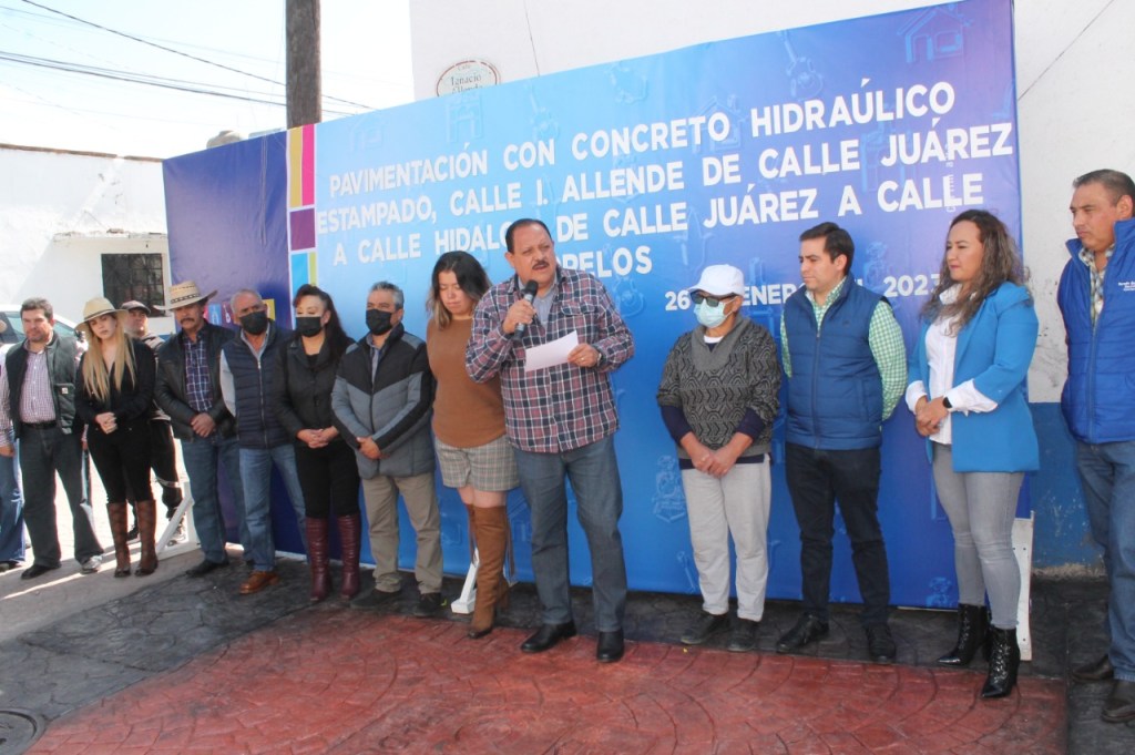 En un primer punto, el Alcalde y su comitiva encabezada por los integrantes del Cabildo, el Tesorero municipal Alexis Noé Garay Martínez, así como de funcionarios públicos hizo entrega de la pavimentación con concreto hidráulico estampado de la Calle Allende en dos tramos.