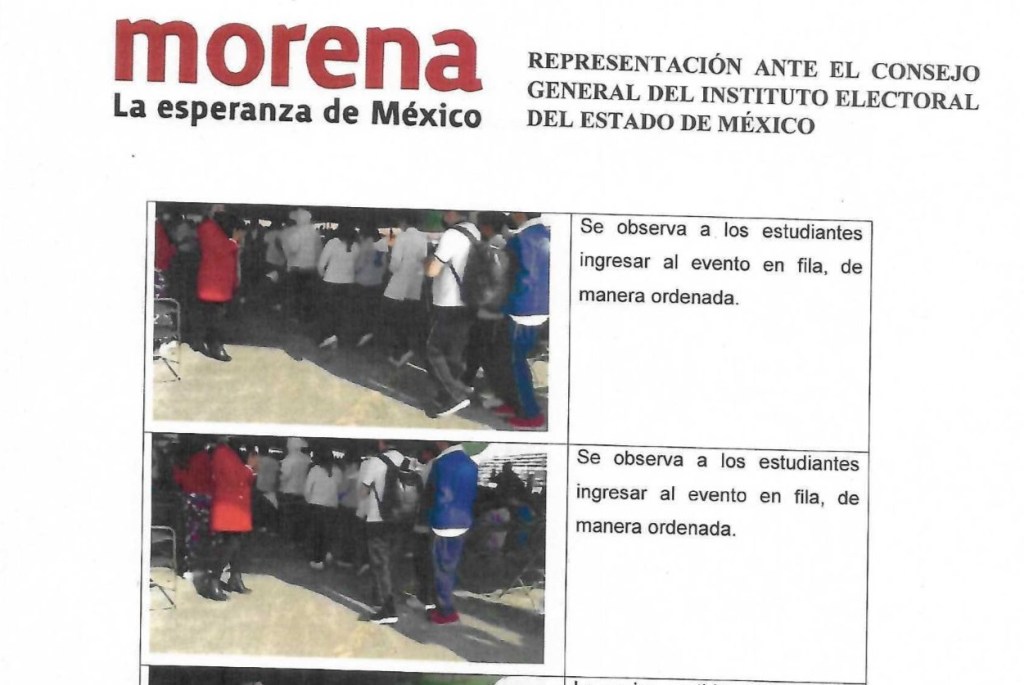 La representación de Morena dijo tener conocimiento que madres y padres de familia denunciaron que sus hijos acudieron al evento luego de que los directivos del plantel utilizaron formatos oficiales del Gobierno del Estado de México para engañar a los menores de edad del Colegio de Bachillerato Tecnológico 2 con la finalidad de acarrearlos a un mitin político en Metepec protagonizado por Alejandra del Moral, en teoria asistirían a una conferencia relacionada con su preparación académica.