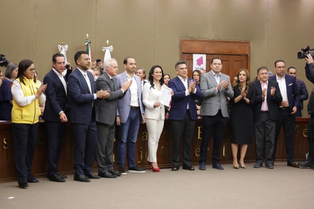 En el evento protocolario, la abanderada expuso que, de acuerdo con la ley, “hemos solicitado el registro de nuestra candidatura al gobierno del Estado de México; por primera vez una candidatura aliancista que se convertirá, también por primera vez, en el primer gobierno de coalición mexiquense”.