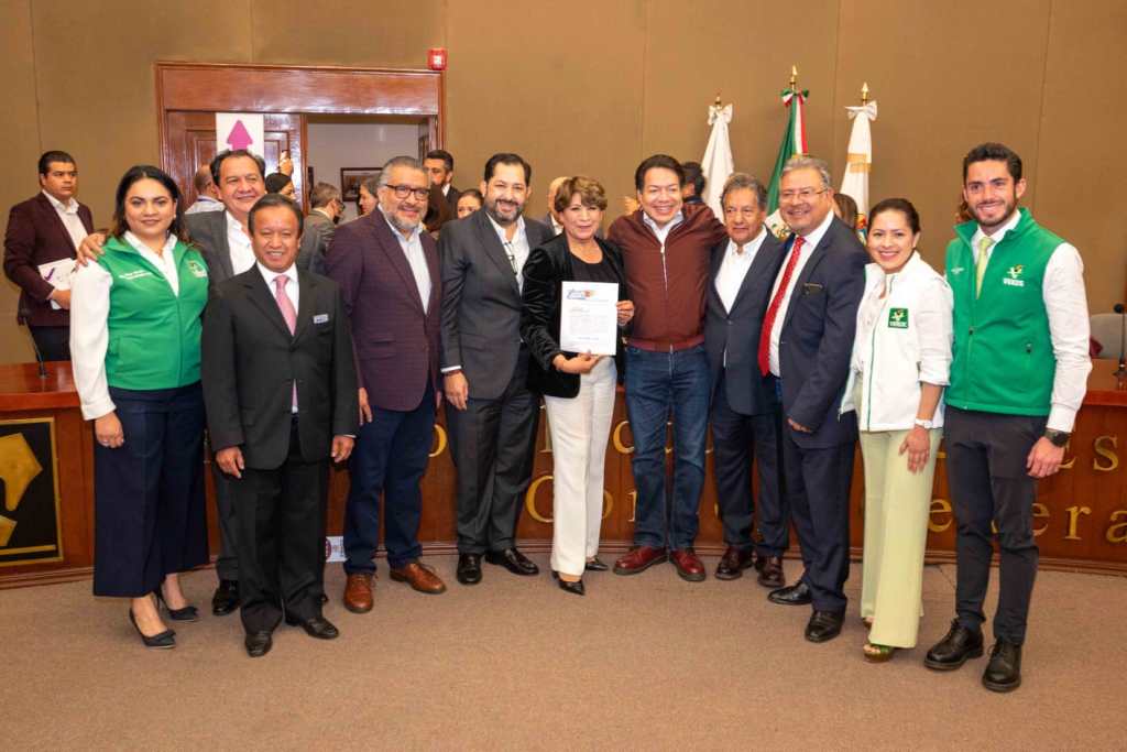 También acompañaron a la maestra Delfina Gómez la dirigente nacional y estatal del Partido Verde Ecologista de México, Karen Castrejón y José Couttolenc, respectivamente; así como el dirigente estatal del Partido del Trabajo, Óscar González Yáñez.