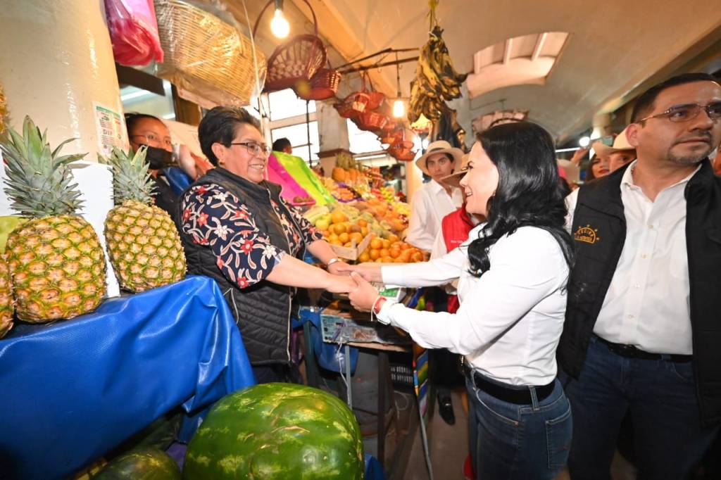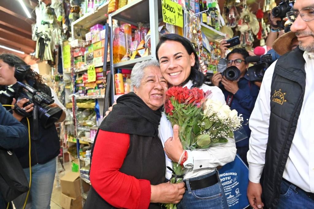Visiblemente emocionada, la candidata a la gubernatura por el Estado de México salió rumbo al mercado Francisco I. Madero, donde caminó entre los puestos de verdura, carnicerías y venta de productos esotéricos, donde los locatarios le pidieron selfies y compartió sonrisa con quienes se cruzaban en su andar.