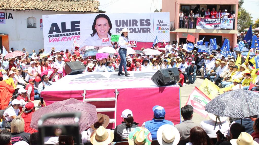 Al visitar el municipio de Zinacantepec, Alejandra Del Moral, abanderada de la coalición Va por el Estado de México, fue recibida entre cohetes, abrazos y peticiones por parte de militantes, simpatizantes y vecinos que se dieron cita en el kiosko de Santa María del Monte.