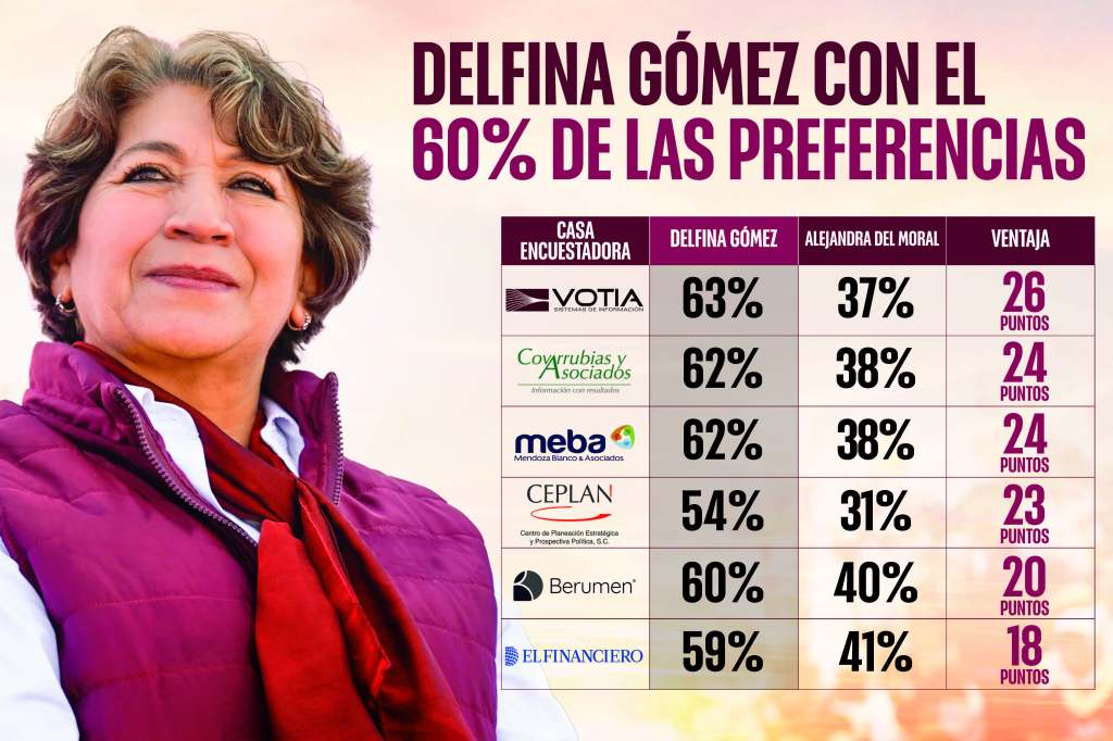 “En las últimas encuestas que se han publicado: Votia le da a la maestra Delfina Gómez una ventaja de 26 puntos; Covarrubias y Asociados, también 24 puntos; Mendoza y Blanco, 24 puntos; CEPLAN, 22 puntos; Berumen 60 contra 40, redondeó, pero son 20 puntos; El Financiero es la más cerrada, son 18 puntos”, apuntó.