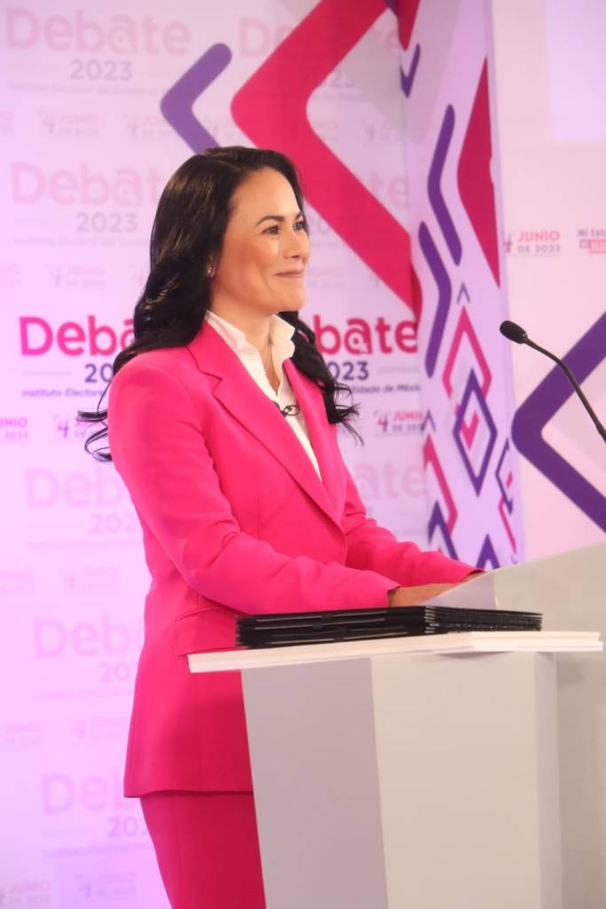 Alejandra del Moral, abanderada del PRI, PAN PRD y PANAL, realizó una puntual exposición de cada una de sus propuestas en las cuatro temáticas: