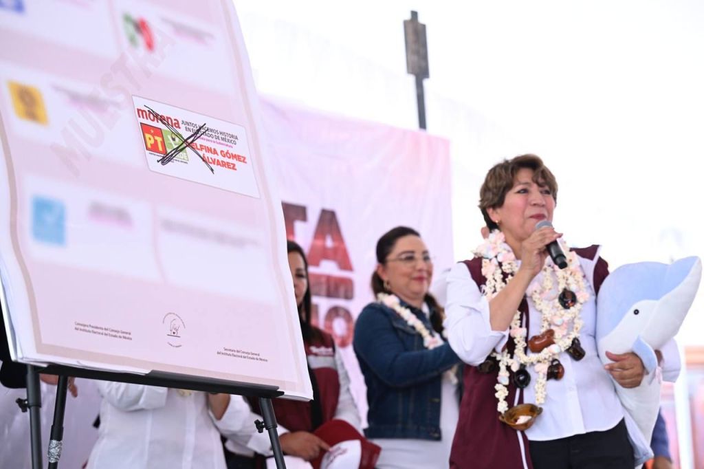 El dirigente estatal del Partido del Trabajo (PT), Óscar González Yáñez, enseñó cómo votar por el cambio verdadero que representa la maestra Delfina Gómez Álvarez, candidata a gobernadora del Estado de México por Morena, PT y PVEM, durante el mitin de campaña celebrado esta tarde en Atlacomulco.