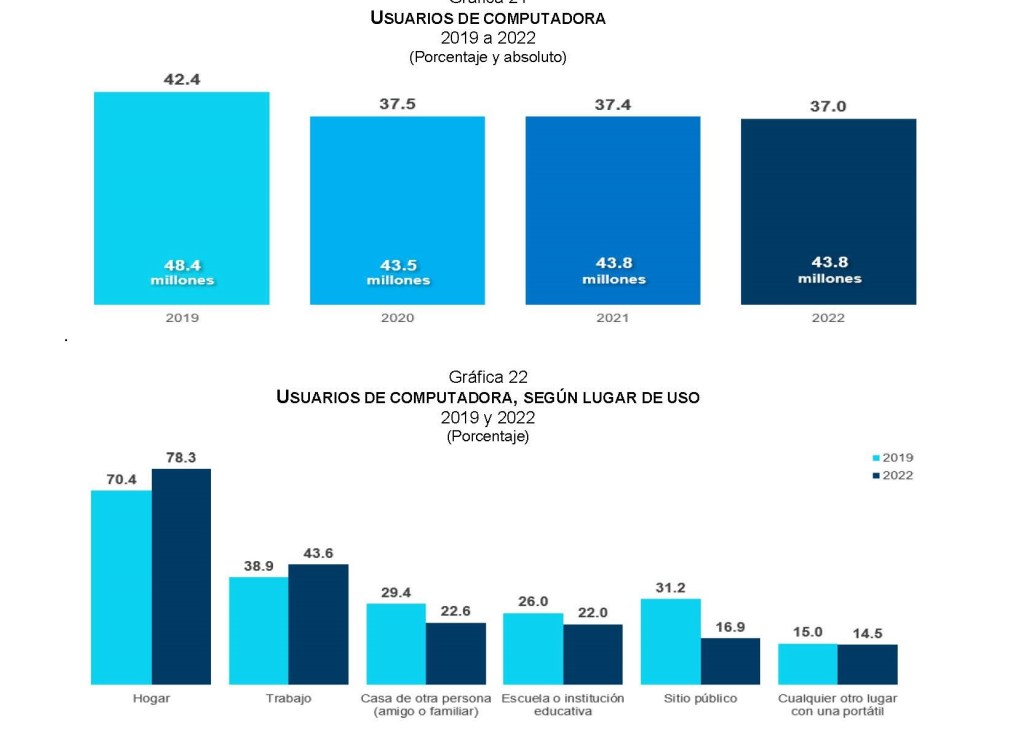 Los porcentajes de personas de 6 años o más que utilizaron computadora en el hogar fue de 78.3 % y, en el trabajo, de 43.6 %, para 2022. Si se compara con 2019, se registró un aumento de 7.9 % de uso en el hogar y de 4.7 %, en el trabajo.