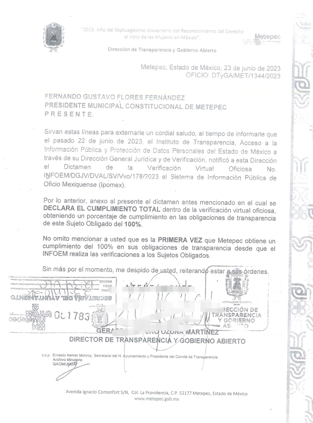 Luego de que el Instituto de Transparencia, Acceso a la Información Pública y Protección de Datos Personales del Estado de México y Municipios (Infoem), determinó que la administración de Metepec cumplió al 100 por ciento con sus obligaciones de transparencia y acceso a la información, el alcalde Fernando Flores Fernández aseguró que continuará garantizando el acceso a todos los datos que maneja el gobierno municipal porque es un derecho que tiene las y los vecinos.