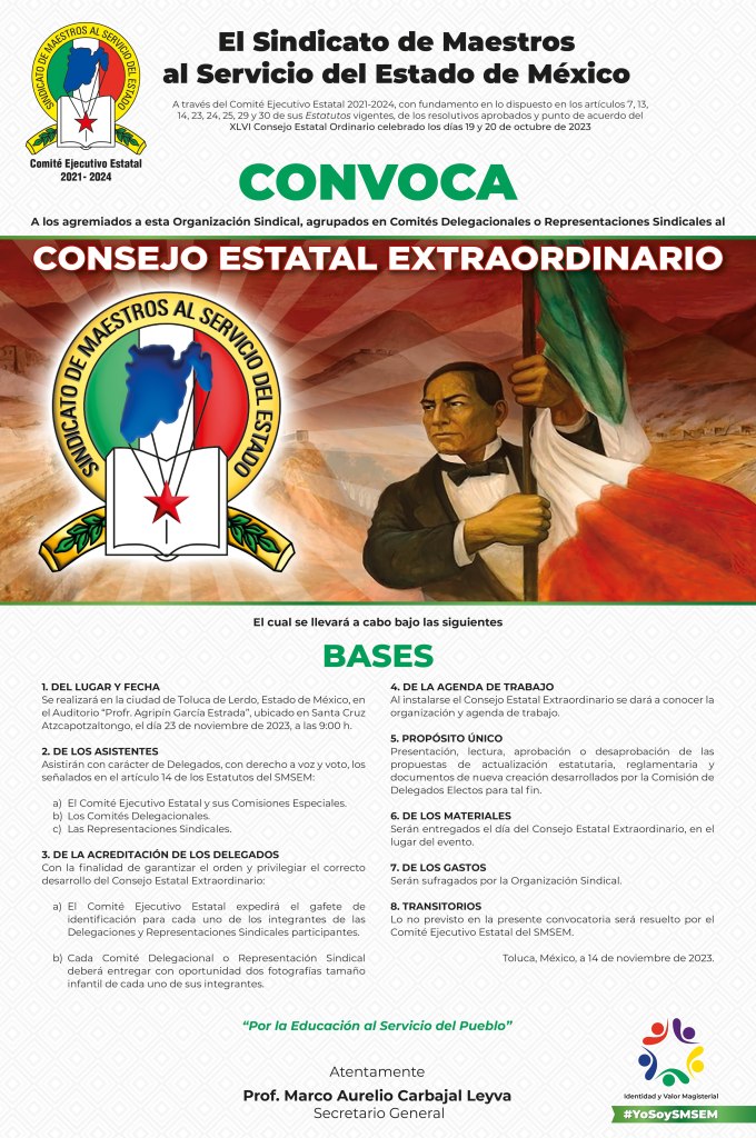 En ejercicio de sus atribuciones conforme a los estatutos vigentes, el Secretario General del SMSEM, Marco Aurelio Carbajal Leyva, convocó a los Delegados Sindicales, legítimos representantes de los docentes afiliados para participar en esta asamblea, programado para el próximo 23 de noviembre.