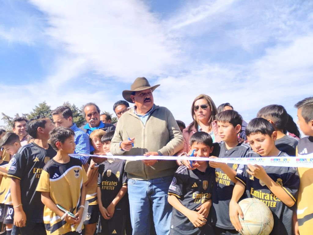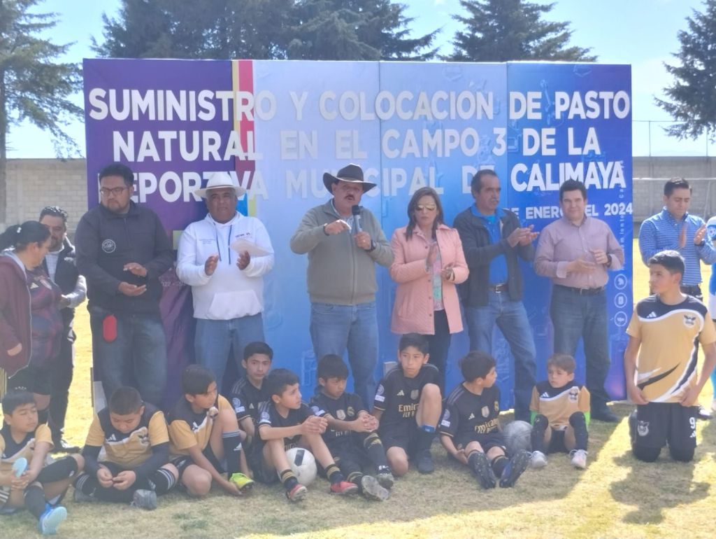 Calimaya, Estado de México, 12 de enero de 2024.- El impulso a espacios recreativos y deportivos continúa registrándose en Calimaya, esta vez fue con la colocación de pasto natural en el Campo 3 de la Deportiva Municipal, junto con una cisterna para que siempre se mantenga en buenas condiciones césped, preciso Óscar Hernández Meza, presidente municipal de Calimaya.
