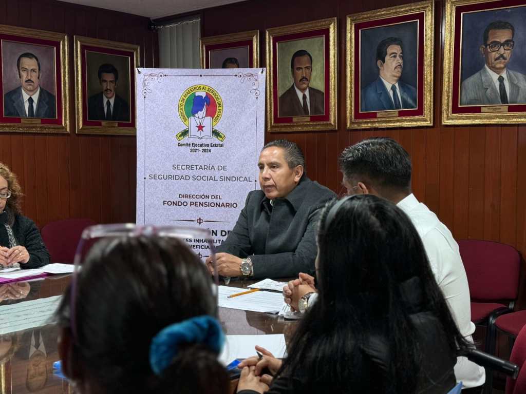 Toluca, Estado de México, a 4 de febrero de 2024. Al reunirse con una docena de maestras y maestros beneficiarios del Fondo Pensionario (FOPEN), el Secretario General del Sindicato de Maestros al Servicio del Estado de México (SMSEM), Marco Aurelio Carbajal Leyva destacó que la reciente actualización de su reglamento lo fortalece y da viabilidad para seguir operando en favor de quienes, como él lo menciona, “son tocados por el infortunio”.