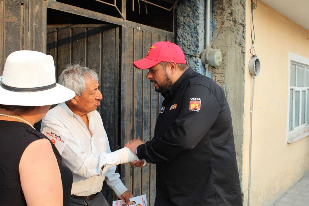 Al recorrer calles de la comunidad de Santiaguito Coaxustenco el petista Jonathan Morales Villegas camino por varios kilómetros en busca del voto de sus vecinas y vecinos.