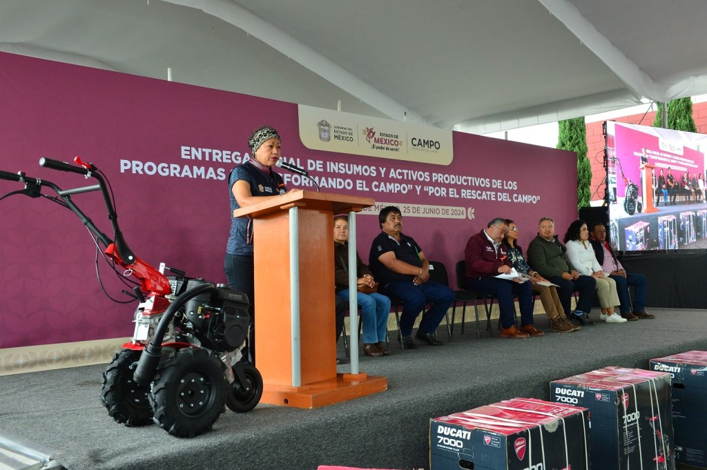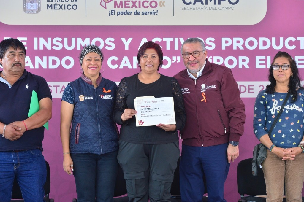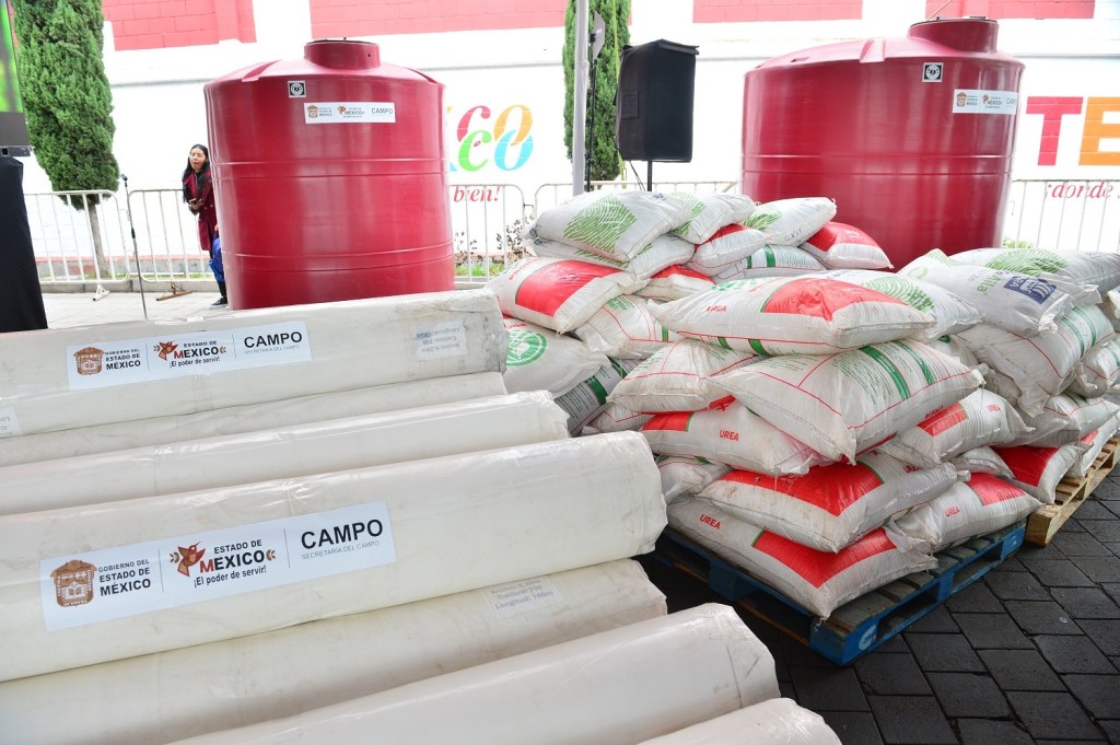 En un evento realizado en el municipio de Texcoco, a nombre de la Gobernadora Delfina Gómez Álvarez se entregaron invernaderos, molinos, maquinaria, cisternas de agua de 5 mil y 10 mil litros, tractores, sistemas de captación de agua y gallinas de postura, entre otros insumos.