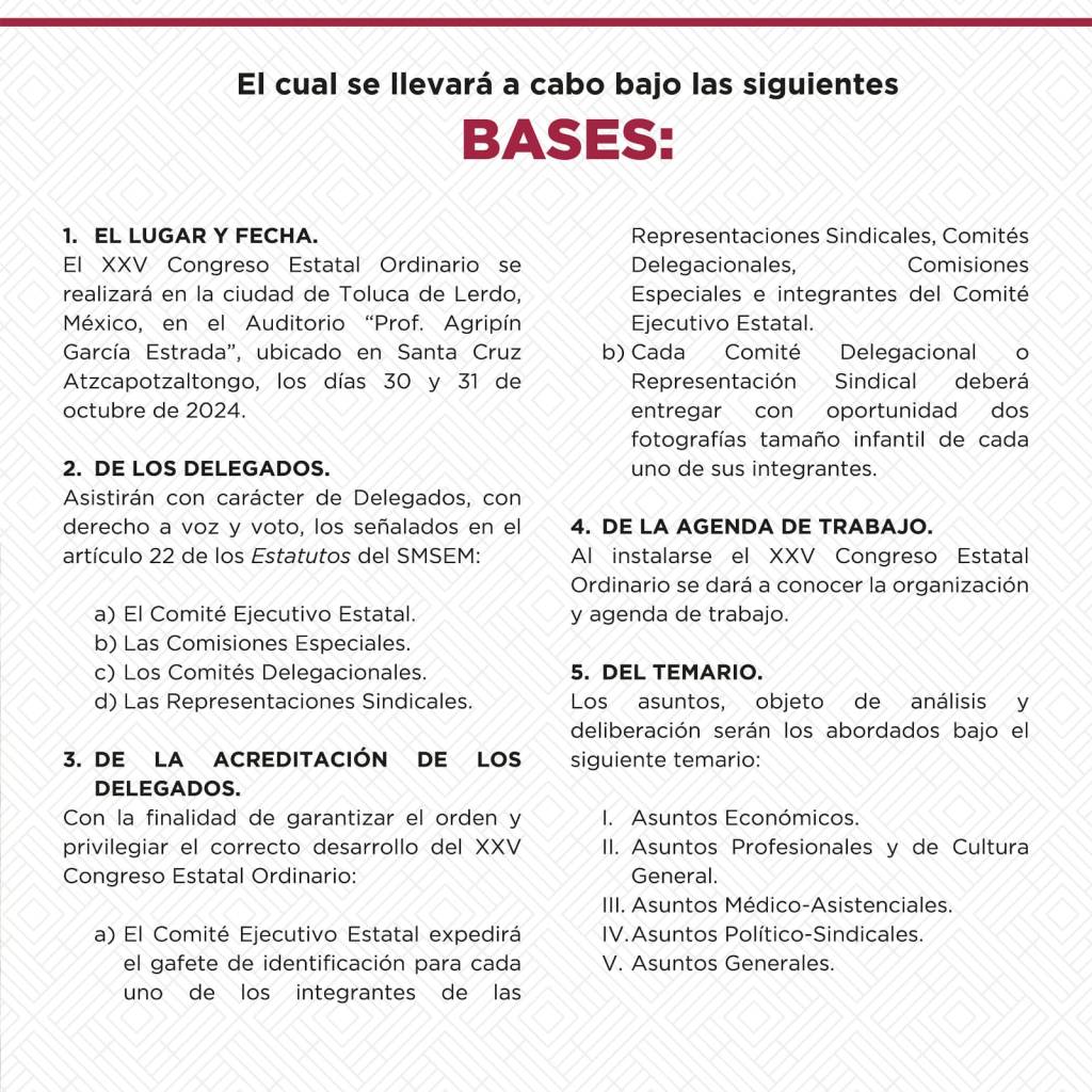 En cumplimiento a los Estatutos vigentes del SMSEM, la convocatoria para esta asamblea fue emitida el pasado 27 de septiembre, dirigida a los integrantes de las mil 22 Delegaciones y Representantes Sindicales, quienes participarán en las Mesas de Asuntos Económicos, Profesionales y de Cultura General, Médico-Asistenciales, Político-Sindicales y Generales, abordando las temáticas que más preocupan al Magisterio Estatal.