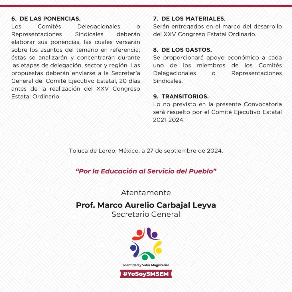 El XXV Congreso Estatal Ordinario del SMSEM será también el marco en el que el actual dirigente estatal, Marco Aurelio Carbajal, presente ante la asamblea su tercer y último Informe de Actividades al frente de la organización, en la que dará cuenta de los beneficios, obras y gestiones desarrolladas en beneficio de los docentes afiliados.
