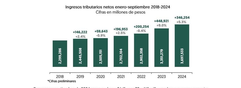 Lo anterior al referir lo acontecido durante el tercer trimestre de 2024, respecto a la recaudación tributaria que alcanzó 3 billones 697 mil 533 millones de pesos.