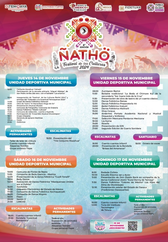 Garantizó que el “Festival Cultural Ñathö” ha sido y será netamente familiar y su temática gira en torno a la cultura de Temoaya, entre otros elementos, subrayó, porque los otomíes son una de las cinco líneas de personas originarias asentadas en el Estado de México.