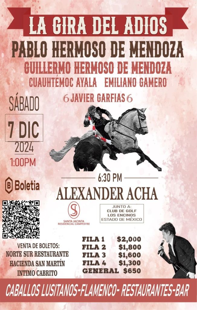 En el cartel están anunciados Pablo Hermoso de Mendoza, Guillermo Hermoso de Mendoza, Cuauhtémoc Ayala y Emiliano Gamero, que habrán de lidiar 6 astados de la ganadería de don Javier Garfias.