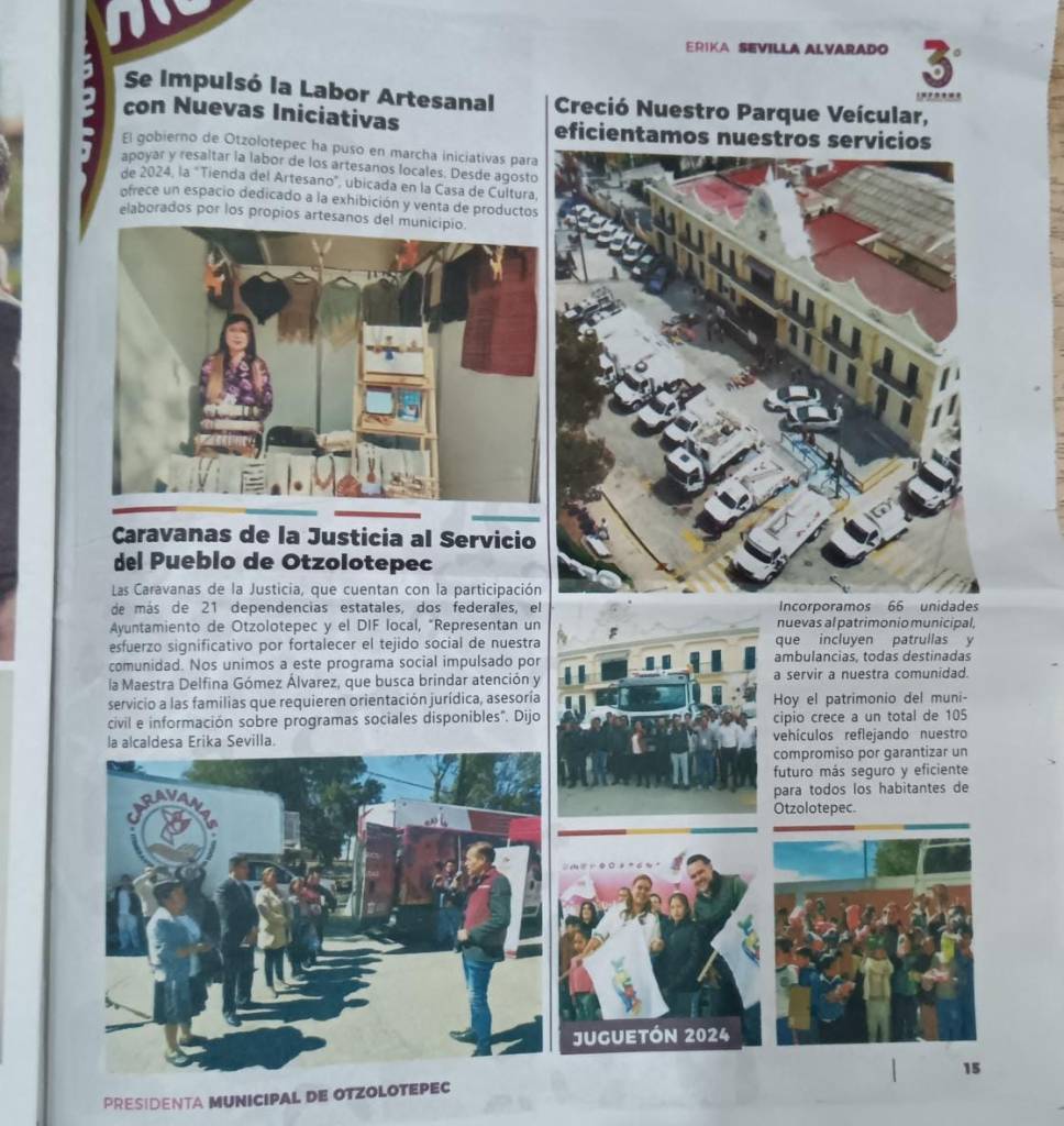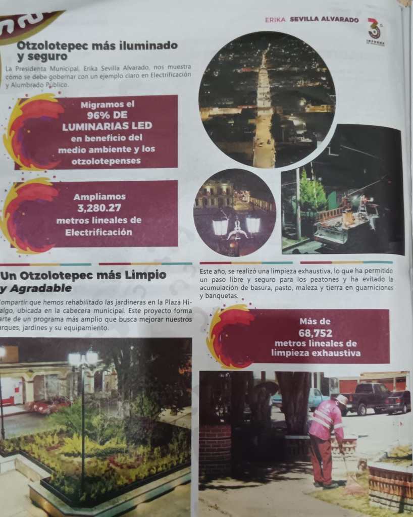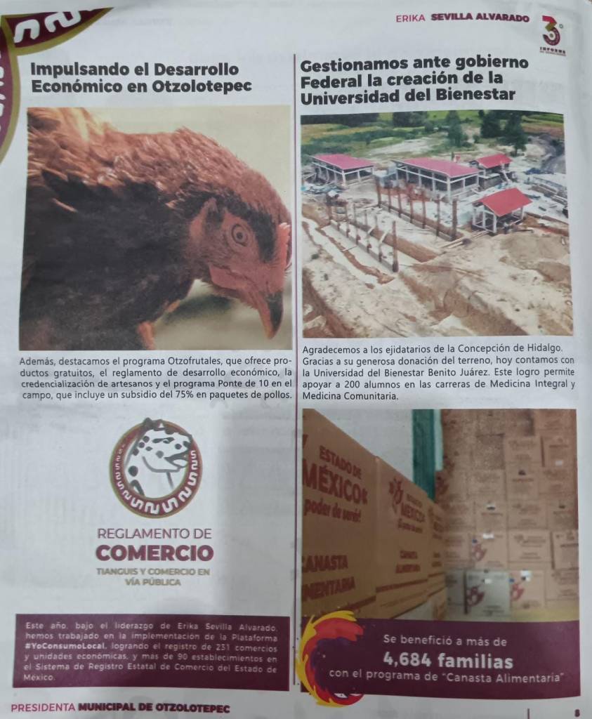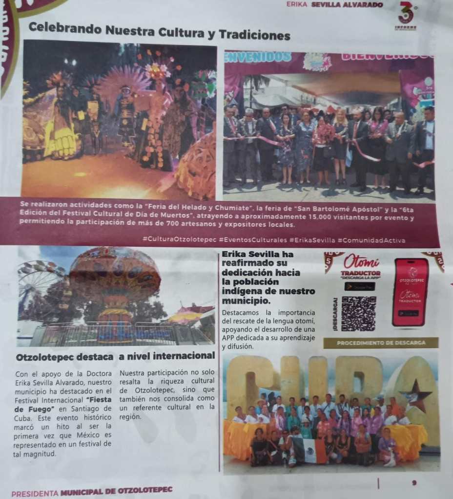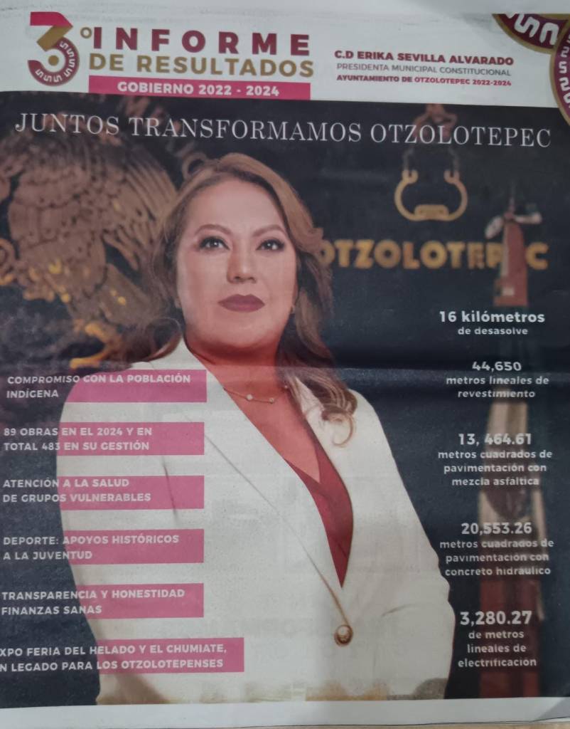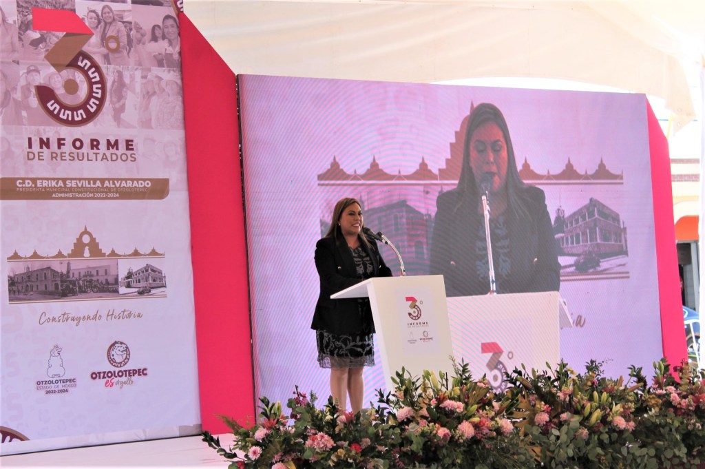 En el marco de su Tercer y último Informe de gobierno al frente del municipio de Otzolotepec, Erika Sevilla, recordó que al tomar las riendas del gobierno local se fijó como meta no fallar a la gente, a sus vecinos, y lo logró realizando un territorio municipal de progreso, bienestar y transformacion el cual está a la vista de todas y todos.