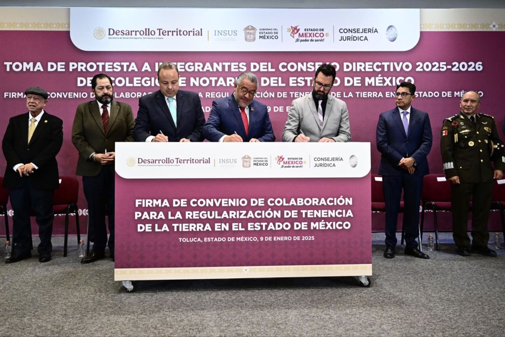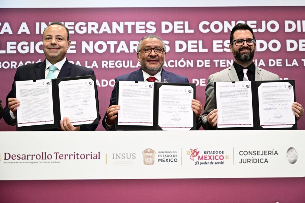 Dicho objetivo es posible a través de la firma del Convenio de Colaboración para la Tenencia de la Tierra entre el Instituto Nacional del Suelo Sustentable (INSUS) y el Colegio de Notarios mexiquense.