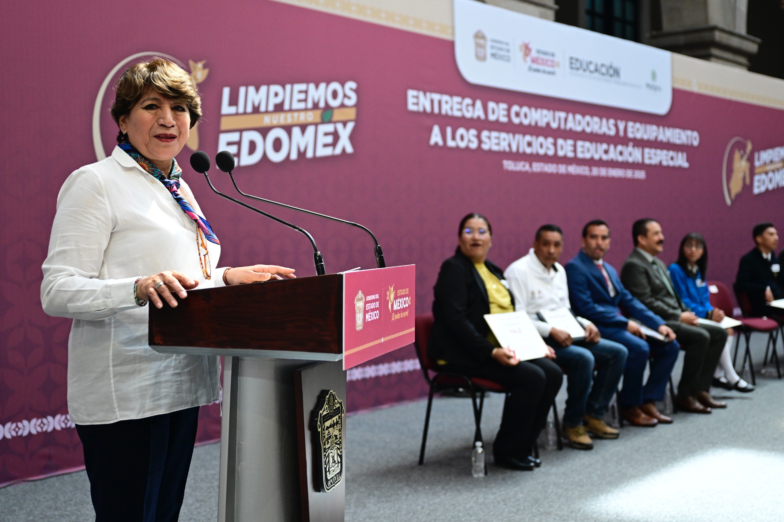 En la entrega de este equipamiento, la Mandataria estatal agradeció la inversión histórica de 56 millones de pesos que realizará el Gobierno de México a través del Programa de Fortalecimiento de los Servicios de Educación Especial que beneficiará a más de 30 mil estudiantes mexiquenses.