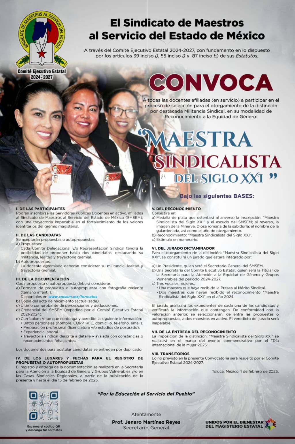 Toluca, Estado de México, a 9 de febrero de 2025. El Sindicato de Maestros al Servicio del Estado de México (SMSEM) mantiene abierto el registro para la distinción “Maestra Sindicalista del Siglo XXI”, reconocimiento dirigido a las docentes en activo afiliadas al gremio, cuyo desempeño sindical y compromiso con la educación sean un referente en la entidad.