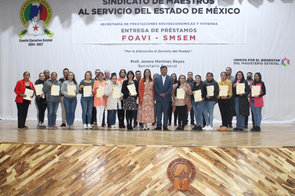 Toluca, Estado de México, 26 de marzo de 2025. Cumpliendo con el compromiso de fortalecer el patrimonio de sus agremiados, la dirigencia del Sindicato de Maestros al Servicio del Estado de México (SMSEM), encabezada por el Secretario General, Jenaro Martínez Reyes, realizó la segunda entrega de préstamos del Fondo de Apoyo a la Vivienda, beneficiando a 29 docentes de las 14 regiones sindicales.