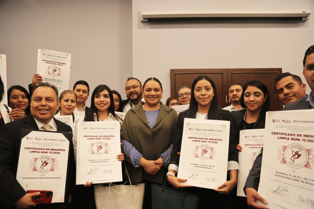 Toluca, Estado de México, 8 de Abril 2025 .- Por su responsabilidad social y compromiso con el cuidado de la naturaleza, el Gobierno del Estado de México entregó Certificados Ambientales a 220 empresas y unidades médicas, los cuales acreditan su responsabilidad con el cumplimiento de la normatividad en materia de procesos y manejo de residuos.
