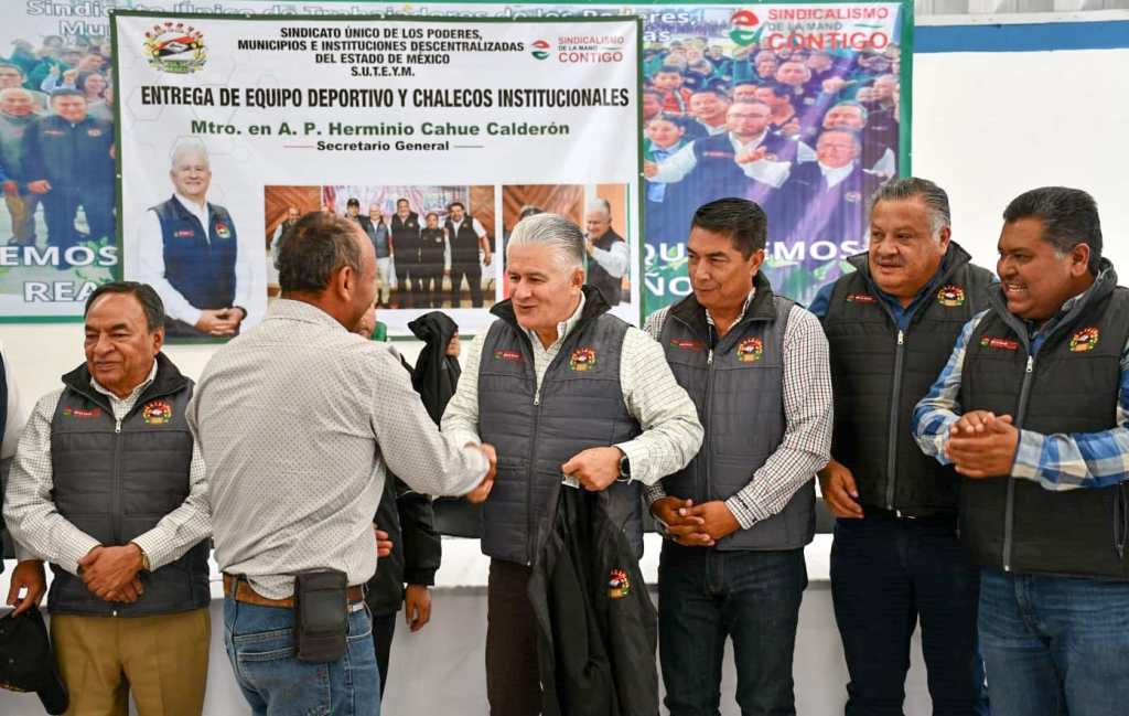 Toluca, Estado de México, 10 de abril de 2025. Herminio Cahue Calderón, secretario general del Sindicato Único de Trabajadores de los Poderes, Municipios e Instituciones Descentralizadas del Estado de México (SUTEYM), presidió las entregas itinerantes de equipo deportivo y chalecos institucionales a delegaciones del sector central de toda la entidad, que beneficiaron a más de 14 mil sindicalistas.