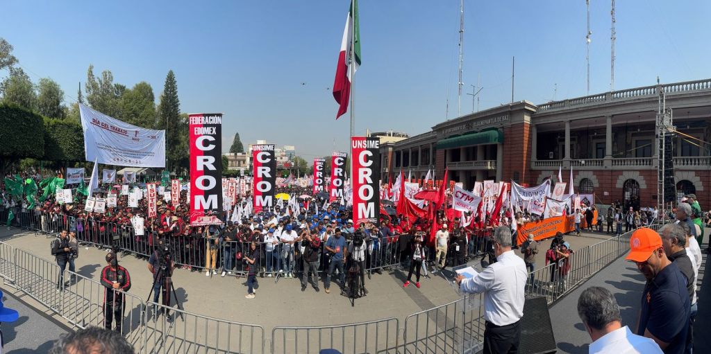 La Plaza Cívica Dr. Gustavo Baz Prada, de Tlalnepantla, fue sede de esta simbólica conmemoración en la que participaron agremiadas y agremiados de la COCEM, CROM, CTM, CTC y del Sindicato Único de Trabajadores de los Poderes, Municipios e Instituciones Descentralizadas del Estado de México (SUTEYM).
