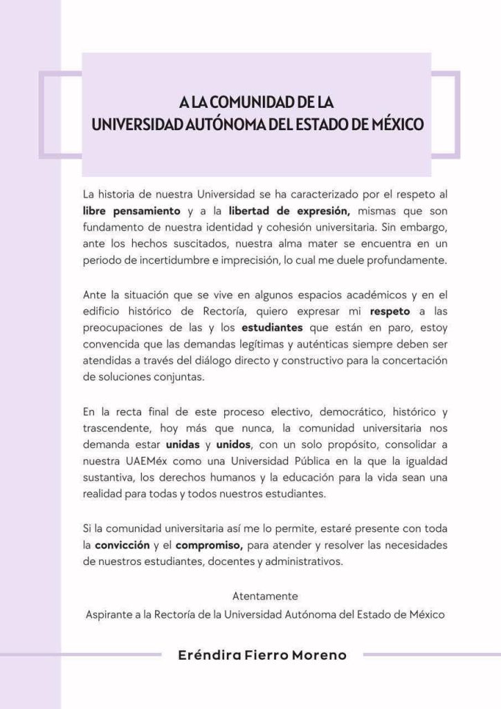 Toluca, México, 7 de Mayo de 2025. – En un contexto de incertidumbre dentro de la Universidad Autónoma del Estado de México (UAEMéx), Eréndira Fierro Moreno, aspirante a la Rectoría, dirigió un mensaje a la comunidad universitaria donde manifestó su profundo respeto al libre pensamiento, la libertad de expresión y, especialmente, a las demandas del estudiantado que mantiene un paro en distintos espacios académicos y en el edificio histórico de Rectoría.