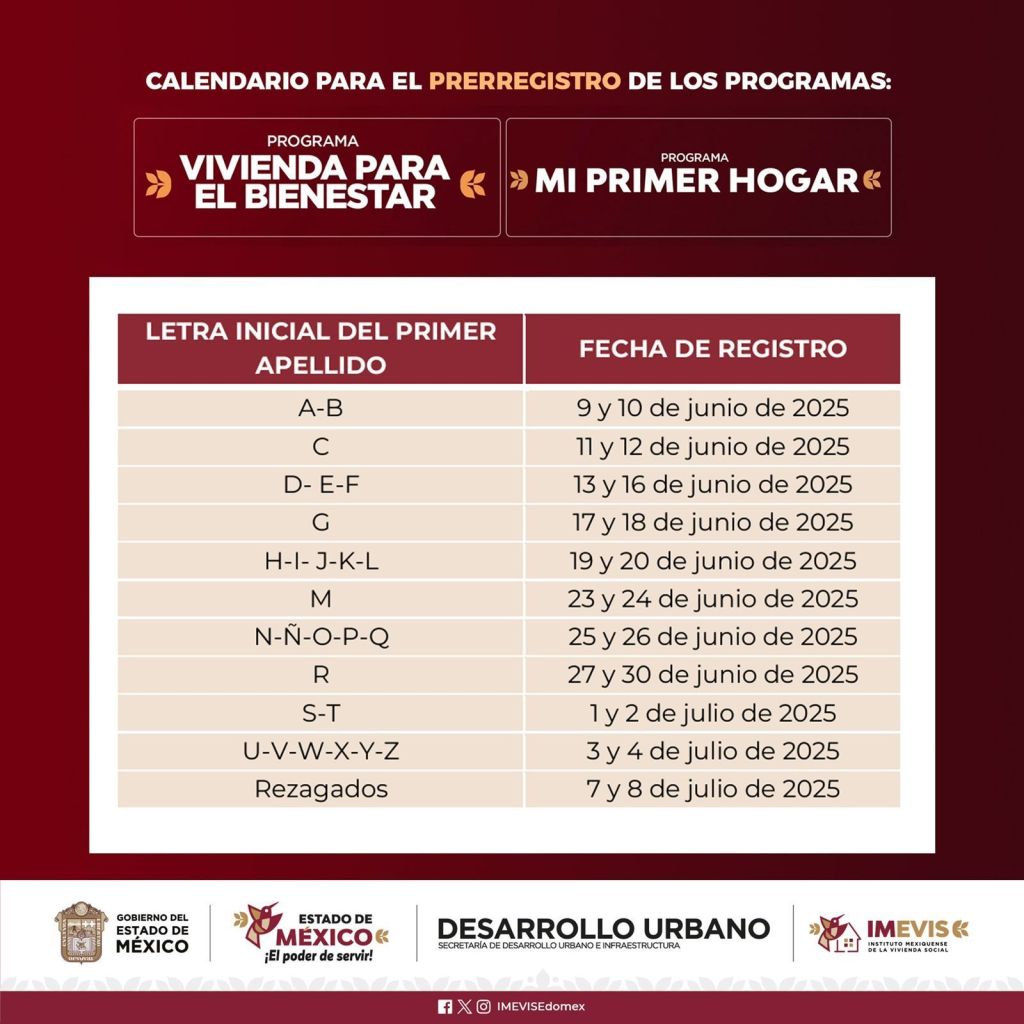 El Imevis operará y coordinará el prerregistro a través de la página programasimevis.edomex.gob.mx, de acuerdo con la siguiente calendarización por letra inicial del primer apellido de los interesados: