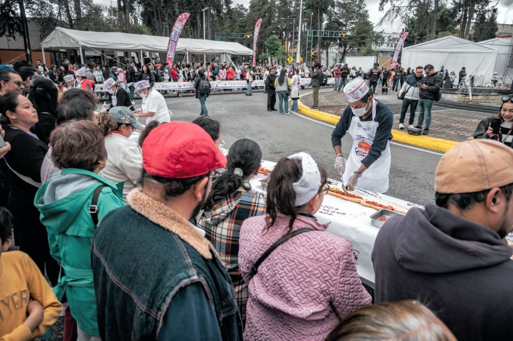 Estado de México, 15 de junio de 2025.- En el Monumento al Centenario de la Independencia, miles de toluqueños y visitantes se dieron cita para degustar la torta más grande del mundo, la cual tuvo una longitud de 82 metros, elaborada con 100 kilos de chorizo rojo y verde.
