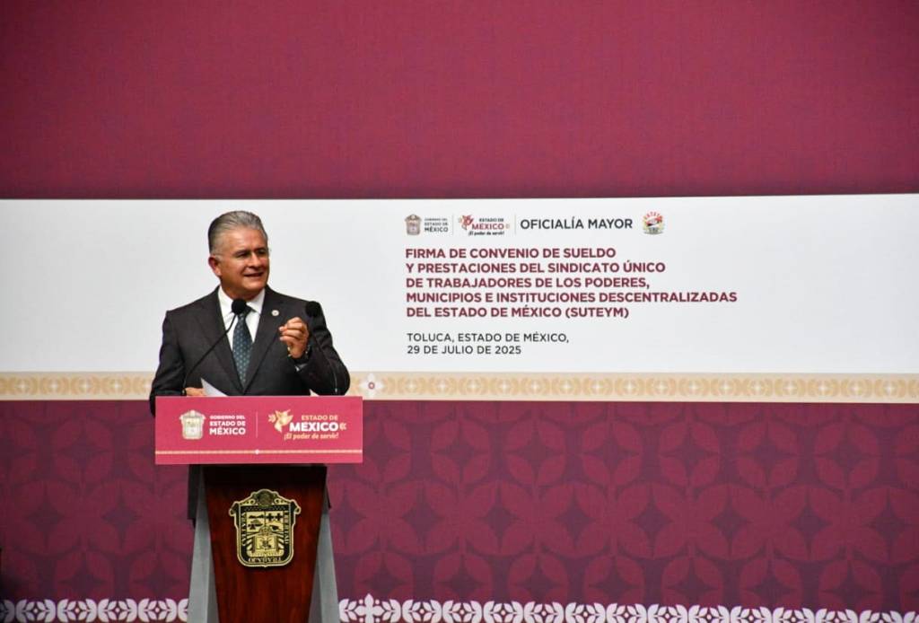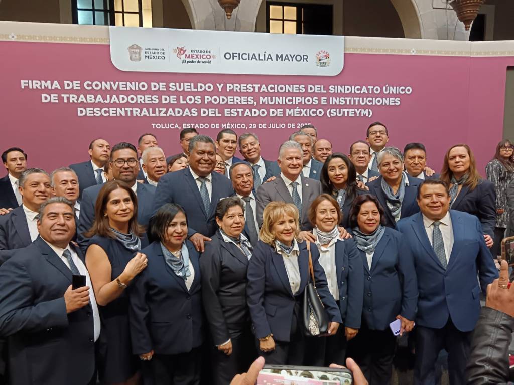 Toluca, Estado de México, 29 de julio de 2025. El Sindicato Único de Trabajadores de los Poderes, Municipios e Instituciones Descentralizadas del Estado de México (SUTEYM) firmó el convenio de sueldos y prestaciones 2025 con el Gobierno del Estado de México, acto que benefició directamente a más de 43 mil personas servidoras públicas del sector central.