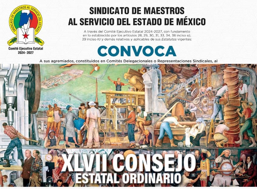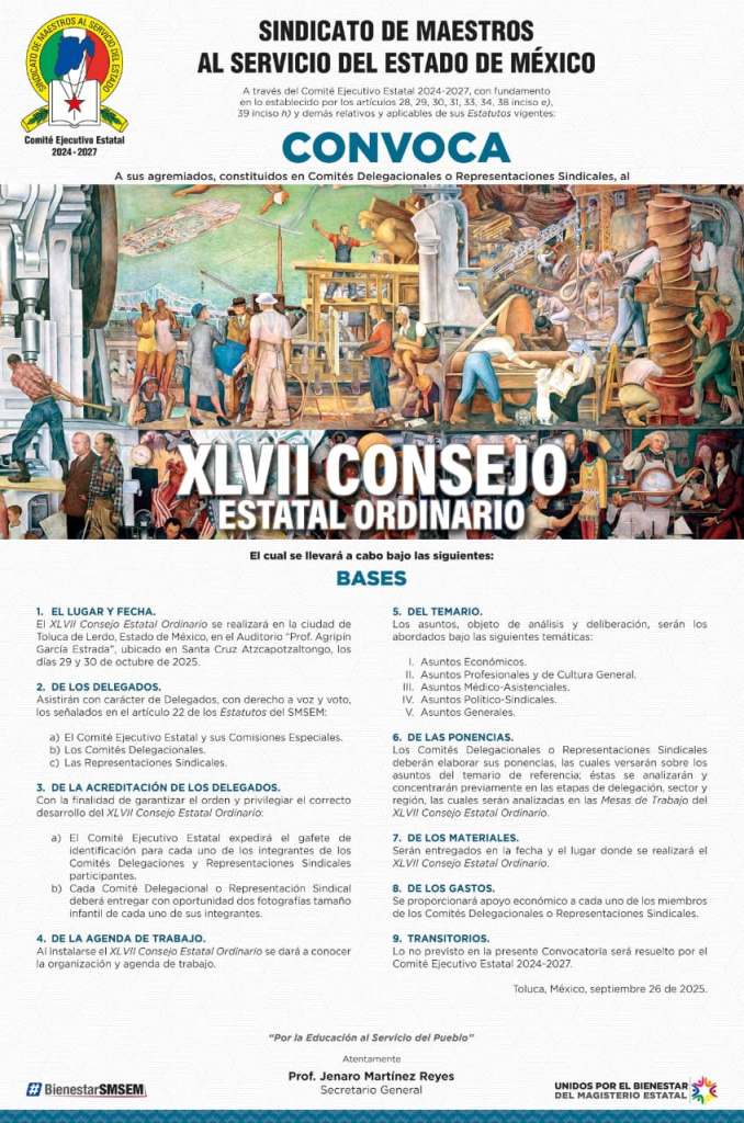 Toluca, Estado de México, 29 de septiembre de 2025. – El Sindicato de Maestros al Servicio del Estado de México (SMSEM), encabezado por su Secretario General, Jenaro Martínez Reyes, emitió la convocatoria al XLVII Consejo Estatal Ordinario, que se llevará a cabo los días 29 y 30 de octubre en el Auditorio “Prof. Agripín García Estrada”, en Santa Cruz Atzcapotzaltongo, Toluca.
