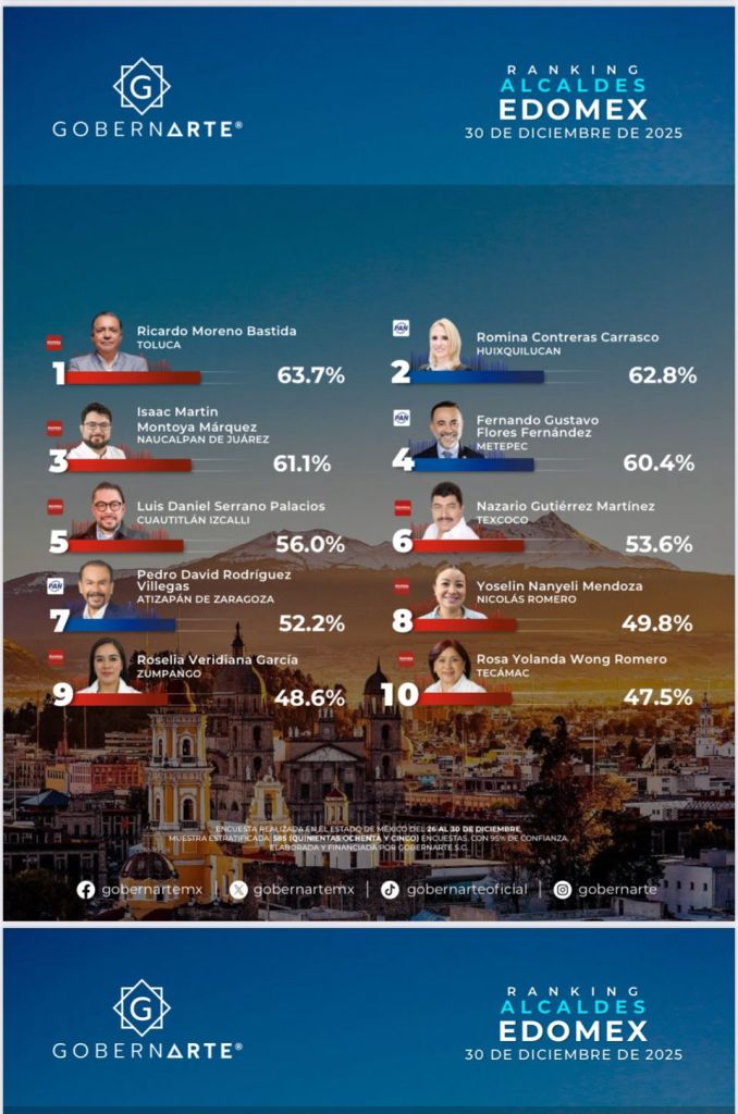 Toluca, Estado de México, 05 de enero de 2026 .— El presidente municipal de Toluca, Ricardo Moreno Bastida, se posicionó en el primer lugar del Ranking de Alcaldes del Estado de México, de acuerdo con la más reciente medición presentada por la casa encuestadora GobernArte, correspondiente al cierre de 2025.