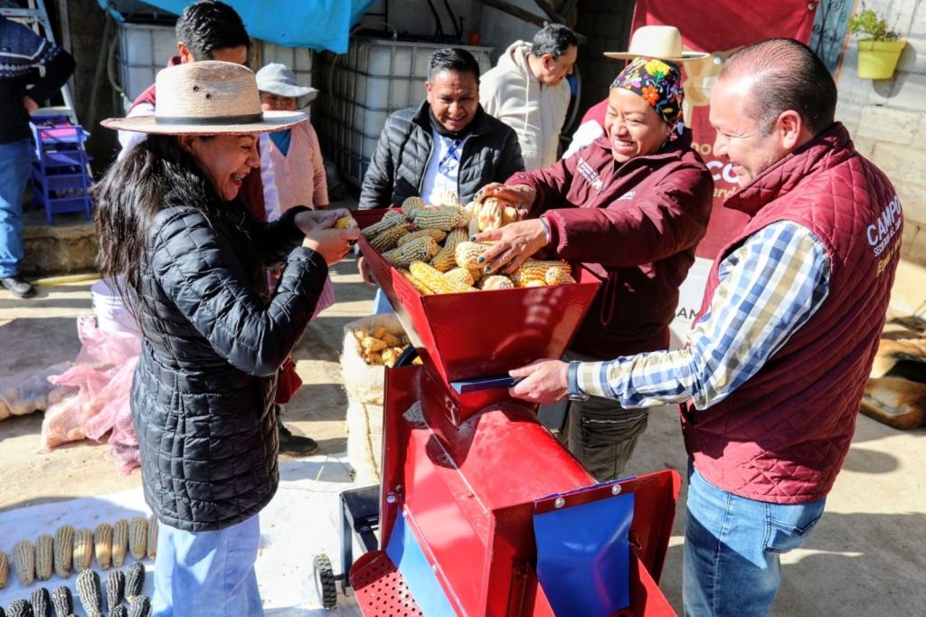 La pareja fue beneficiada con una desgranadora del programa estatal Rescate del Campo, el cual apuesta por una producción más eficiente, sostenible y segura, mientras que, a nivel federal, participan en Escuelas del Campo y Cosechando Soberanía, programas que promueven la agroecología y el fortalecimiento del tejido comunitario.